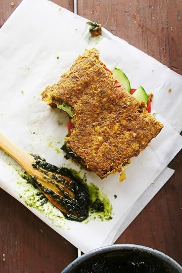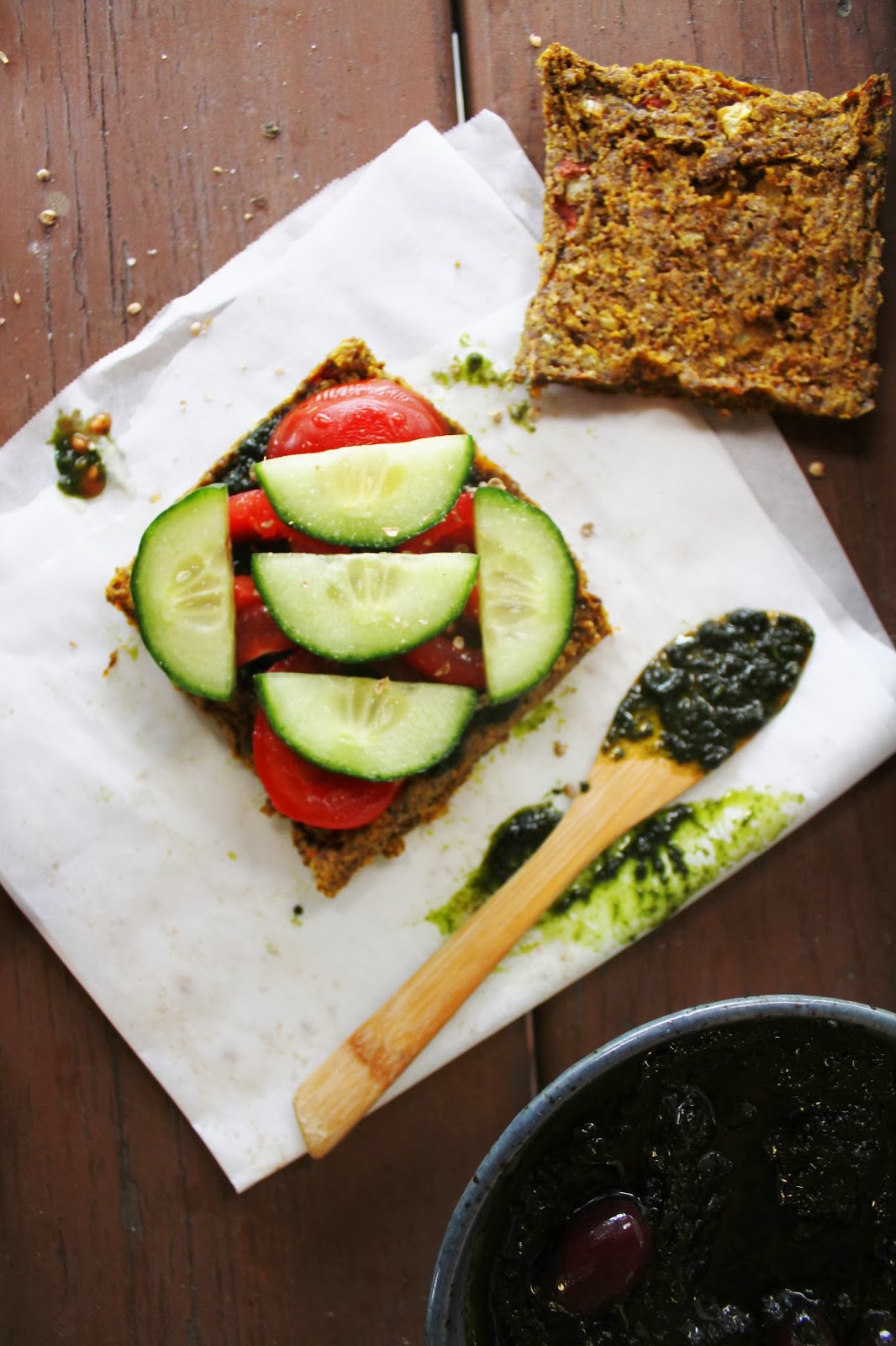 I literally could not stop eating this. It tastes so incredibly vibrant and delicious that I bet you won't be able to control yourself either. The bread is most, chewy and bursting with flavour from the veggies it's made from; so it pairs perfectly with the fillings of tomatoes, cucumber and kale & olive tapenade, because those ingredients are supa fresh too.
