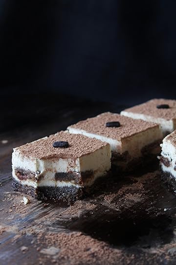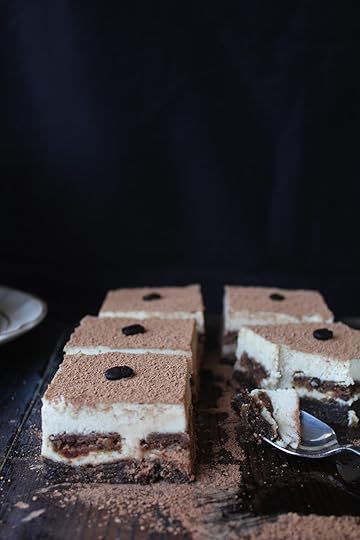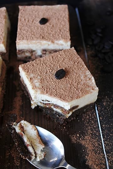 When ready to serve: gently take the tiramisu out of the pan, dust with cacao powder, and slice into squares with a sharp knife.