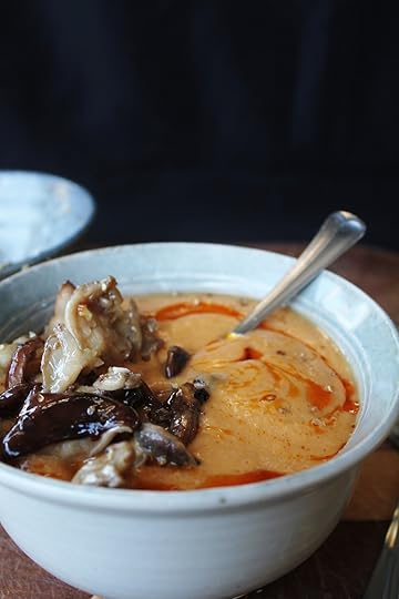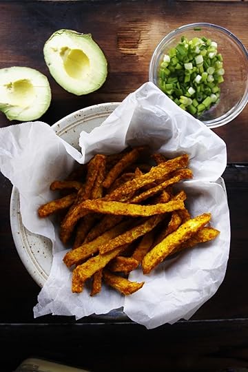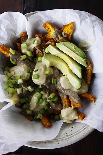 The "fries" are slices of jicama (a turnip-like sweet root) coated in spices and olive oil, the gravy is a mushroom-onion sauce and the "cheese curds" are spoonfuls of a creamy cashew-herb cheeze. I added avocado and chives to mine for extra colour and more textures. I'm not claiming this tastes like the original, and it doesn't even really look like it, but guess what: I don't care. This is a delicious, healthful recipe all by itself that just happens to be inspired by poutine, and there's nothing wrong about that. Dig in.