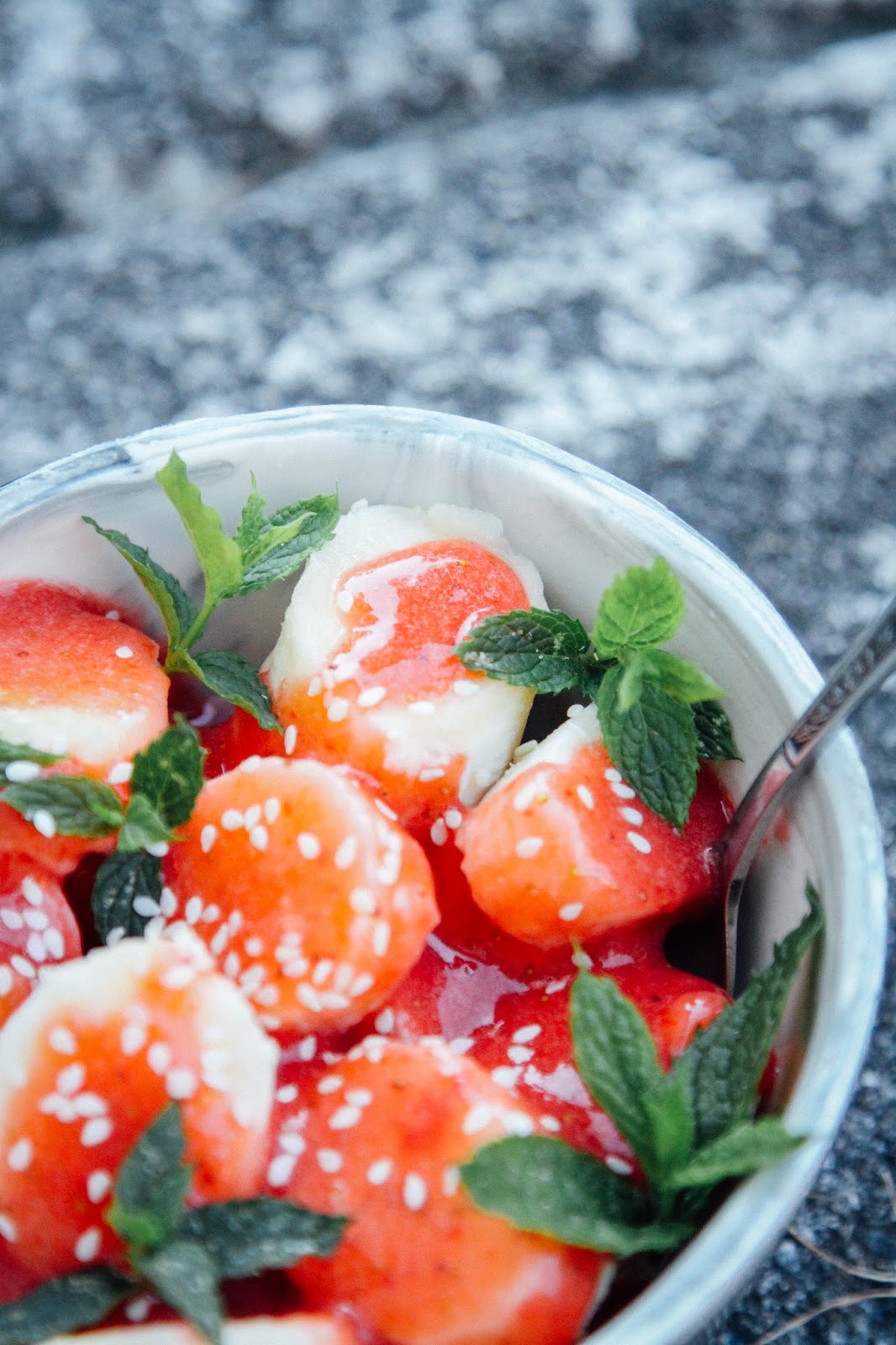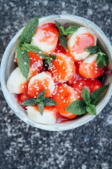 Cut up the bananas and place in a bowl. Blend the strawbs with the maple syrup and pour over the bananas. Decorate with mint leaves (I also added some sesame seeds for aesthetics).