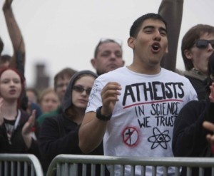 Nearly a thousand atheists gathered in the Mall in Washington yesterday for a rally. The dismal weather reflected their sad message. An aging college professor from England spoke about atheism and tried to enthuse the crowd. Several comedians and television presenters also spoke.