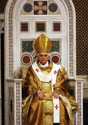 Seated on the cathedra of St John Lateran, Benedict XVI, Bishop of Rome, Vicar of Jesus Christ, Successor of the Prince of the Apostles, Supreme Pontiff of the Universal Church, Primate of Italy, Archbishop and Metropolitan of the Roman Province, Sovereign of the State of Vatican City, Servant of the Servants of God.