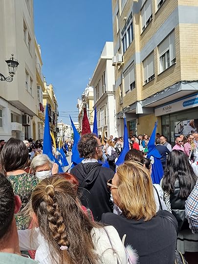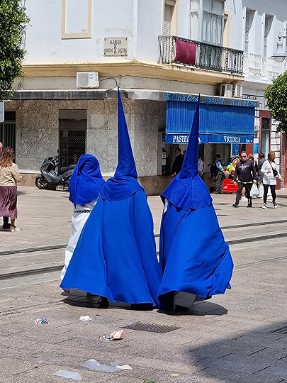 Semana Santa (Easter week) has started here in Spain and so I took myself to see an Easter procession. The first thing you notice is all these people (some of them kids) in KKK hats, blue, black and white, complete with long belted gown. These are the penitentes (and I hope they’re truly sorry!). The view out the eyeholes must be distinctly curtailed; it’s bad enough seeing over my COVID mask. Still, you don’t see them tripping over. The most spectacular, and to my Australian atheist eyes, odd part of the whole thing is this gigantic carved float with the Holy Family sitting up on it. It sort of sways past, borne coffin-like by a bunch of guys walking, and everybody stretches their necks and the kids climb up the railings and the brass band plays and the carriers of shiny things (crosses, mitres, whatever) shake them in the air and everybody wears their best boots and pantihose (which are still ‘in’ here) and their slinkiest outfit…