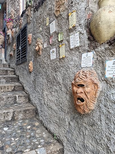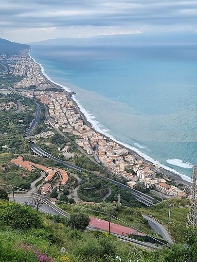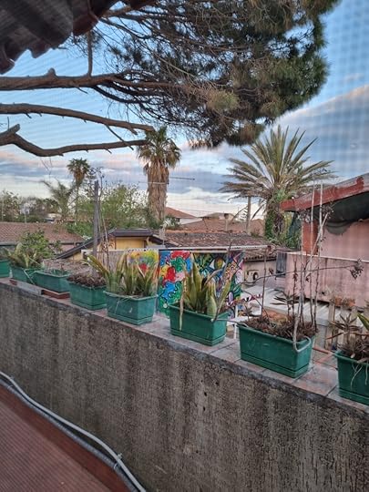 View from my balcony in the villageI’m staying with a family in a village just outside Catania. The house smells of cat pee (there are kittens!) and the kids are hyperactive and the beach is at the end of the street so – Paradise. I must be about the last person to discover Airbnb (just like I was the last person to get a mobile phone, and just in time for Airbnb to have become about as popular as Putin) – but hey, being thrust into the midst of ordinary (although evidently hard-up) Sicilian life beats sitting in a beige hotel room. And to be fair, I’m only taking up the attic, so not rendering any locals homeless. The day for these guys begins about ten and I don’t think anyone shuts up till midnight, a liveliness that I find appealing rather than irritating. I haven’t spotted any Mafiosi yet; probably hiding in plain sight. The cars are all dusty – I’m guessing either pollution or detritus from the volcano. I clutch my purse, out of caution, but there seems no particular need (mind you, last time I was in Italy in the 90s someone nicked my wallet).