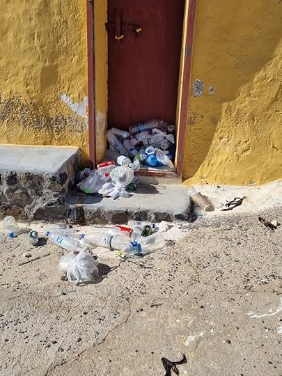 Never mind (I’m in Crete now, so no skin off my nose). I wanted to see Thera because of its famed loveliness, and because the last big eruption, roughly in 1600 BC, blew half the island off and destroyed Minoan civilisation. Which was pretty civilised, at least for the upper classes; plumbed toilets, multi-storey mansions with airy windows and charming wall paintings, piped water. Now I have seen it and it is stunning (at least, the views of the caldera, with its sweeping cliffs and sapphire bay, are). But the purpose of Thera nowadays is unquestionably to host holiday-makers. (In fact some would say that’s the purpose of Greece.) There’s something weird and unsettling about a place that has no reason to exist other than so people can get brown, have Sex on the Beach, and waft around in Greek goddess outfits. Speaking of which, it feels to me like a place that the gods have marked for imminent destruction (being gods, this might mean anywhere from tomorrow to next century).