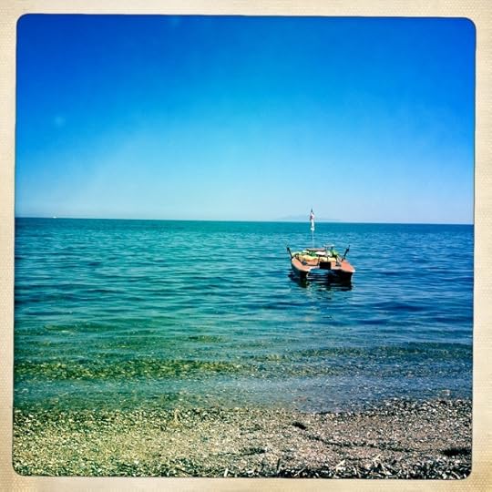Fokuserar på ljudet av vågorna som slår mot stranden om och om igen. Ett svepande, ett rasslande av vatten mot sand och småsten. Hör avlägsna röster i mitt huvud. En äldre pensionär på norskbruten engelska klaga på sin drink, några barn skrattar av förtjusning när vågorna sveper emot dem, en klingande skål mellan det medelålders australiensiska paret med sina breda leenden och rödbrända ansikten när de slår ihop sina skummande ölglas redan innan lunch.