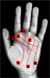 1: Life line - 2: Head line - 3: Heart line - 4: Girdle of Venus - 5: Sun line - 6: Mercury line - 7: Fate lineThese main lines above are fairly well known, but the lesser lines are not quite so well understood and it was these I was studying when I got the idea for Marked for Magic.
