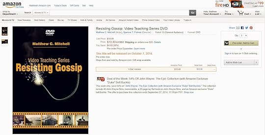The complete Resisting Gossip Video Teaching Series DVD is available now for pre-order on Amazon. It includes all ten lessons (with music by The Gray Havens), 3 book trailers (good for introducing resisting gossip to your church, group, or organization), and the blooper reel. The DVD releases on October 7th in conjunction with