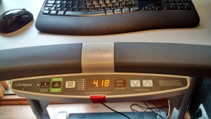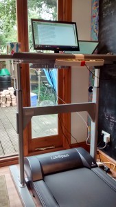 These are undeniably expensive things. I paid a painful £1500 for mid-range treadmill, desk and installation. (The £ cost seems to be equivalent to the $ cost, presumably because of bigger US demand.) You could bodge up your own desk, I guess, if you were competent and didn’t mind not having the data. They are also big: the set-up takes up a good third of my writing shed. So there’s no denying that you need room and cash to make this happen at home. If you work in an office, get to HR right now and see if they will cough up for a few machines for people to share. (You can get standing desks, which are obviously much cheaper; I can’t stand up for very long without discomfort so that wasn’t an option for me.)