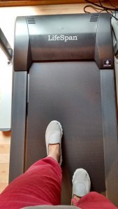 I got the Lifespan desk to go with. It’s manually adjustable so it’s the right height with comfortable wrist supports, and it’s really sturdy and large – accommodates laptop, separate monitor, wireless keyboard, multiple mugs. It also has a console which tracks your time, steps, calories and distance walked. This is really addictive. It tracks you all day and keeps the data during breaks, unless you accidentally yank the safety cord and reset it, which I have only done once so far.