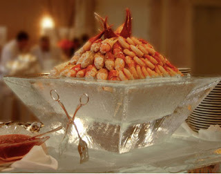 I’m sure you are nodding as you read the above, and thinking, “Well, what kind of dolt would do that?”This dolt.It was a few years ago, and Ms. Roberts had graciously invited her home chapter of RWA to join her and her many other guests for cocktail hour in her suite. It was perfect…view out the windows glorious, delicious and varied spread of cheeses and dips and seafood, waiters with drinks on gleaming trays, fabulous clothes and sparkling party jewelry. The room was packed with well-known and much loved writers, very important editors, publicists and fans and fellow WRW members like me who were thrilled to mingle and have a couple of munchies and a fortifying drink before the Awards Ceremony.I was nervous, as always, like most of us there, hoping to make an impression on those we wanted to do business with. I had my elevator pitch ready and my new high heels on and was keeping my eyes peeled for an editor I was dying to chat up. I decided I’d grab a drink, but realized sensibly it would be much smarter to first take a lovely little cocktail plate and grab a few bites. The line was forming, shoulder to shoulder hungry writers were starting to queue up, and I somehow, with a graceful step or three, managed to plant myself right in front of an amazing display of shrimp. A gorgeous silver bowl of the plumpest, freshest, yummy little creatures sat on a table covered with crushed ice, the enormous bowl tilted just so one could poke a toothpick in and spear one without any effort at all. Plate in one hand, toothpick in the other, I first spooned on a tablespoon of lovely red cocktail sauce, then speared a shrimp. I plopped it on the plate and frowned, not sure but wondering, did the silver bowl gently, oh so freaking gently, begin to turn on its bed of ice? I thought it might have, no more than a degree clockwise, if I remember right. The room was warm, the ice was melting just a bit, but no problem. Surely. I speared a second shrimp. When I picked the thing up from the mountain where it perched with a thousand of it’s lovely pink buddies, disaster.Like card 101 in a design that could only ever balance 100, the silver bowl of shrimp moved again. Wildly . The thing took a full, dizzying ninety-degree spin, and one second later tipped forward and spilled at least half its content onto the table, onto the table cloth, onto the floor of Ms. Nora Robert’s suite.And onto my totally shocked and humiliated feet.It made quite a noise. A crash, actually. Ice, silver, shrimp, glass. I don’t know what broke, but something did.One hundred people fell silent. And then an anonymous voice from across the room asked gently, “Is everyone thinking, Thank god I didn’t do that?”Which was hilarious at the time to everyone but the woman with seafood stuck between her toes.In an instant a waiter in a black coat appeared at my elbow. He smiled at me and then spoke into a walkie-talkie, which appeared in his hand as if by magic.“We have a shrimp emergency,” he said. Clicking sounds. Static sounds. Then a disembodied voice asked, “Is there sauce involved?” The waiter met my eyes. He looked relieved. “No, no sauce.”Many more people in black coats appeared. The shrimp was cleaned up. Replacement bowls of the jumbo little devils arrived. The hostess was gracious and kind and did not have me thrown out of her penthouse window. She waved me to come over to where she stood, sympathetic and smiling, and had me sit down while people brought me drinks. Later that evening, after all the fun, I had an excellent discussion with the editor I was chasing, but it centered on faux pas in public, not my book. I believe she said me vs the shrimp was the worst she had ever witnessed. Ha.Ha.Ha.Yay! I made an impression!Okay, so lesson learned and duly passed onto fellow Conference goers. “Step away from the shrimp”, as my dear critique partner, Elaine Fox, now whispers in my ear whenever we’re in a buffet line anywhere .