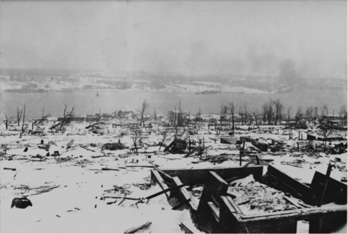On the morning of December 6th, as men set off for work and children made their way to school, two ships collided in the Harbour. One of them, the French vessel Mont Blanc, was fully loaded with explosives – TNT, picric acid, airplane fuel and gun cotton. The collision sparked a fire. Knowing their deadly cargo, the crew of Mont Blanc took to the lifeboats and left the ship to drift into a pier in Halifax’s industrial North End. At 9:04 am Mont Blanc detonated in what is still the largest non-natural, non-atomic explosion in recorded history.