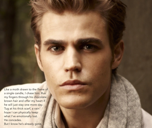The idea (from the fabulous brain of Susan Peterson Wisnewski): Write a piece of flash fiction (less than 150 words) using these three words: chocolate, candle, scarf.Oh what fun this was. In the end, I not only managed to keep it short (58 words!) but turned it into a visual piece. I didn't have Paul Wesley in mind when I wrote this (let's face it, I'm way more into Damon than Stephan on The Vampire Diaries) but once I started searching for images to put with the piece, he fit the bill nicely.