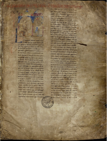 Above: the first folio from an Old French version of William of Tyre’s “Historia rerum in partibus transmarinis gestarum”, which belonged to Isabel Bruce, and the ex libris announcing her ownership is in red ink across the top of the page.