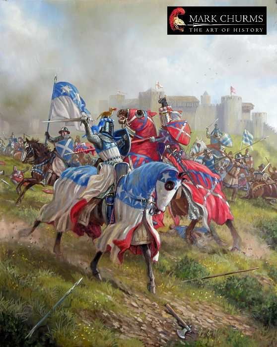 Battle Image is MarkChurm.com painting of the fight to the death where James Douglas slays Robert Neville, the Peacock of the North, 1317