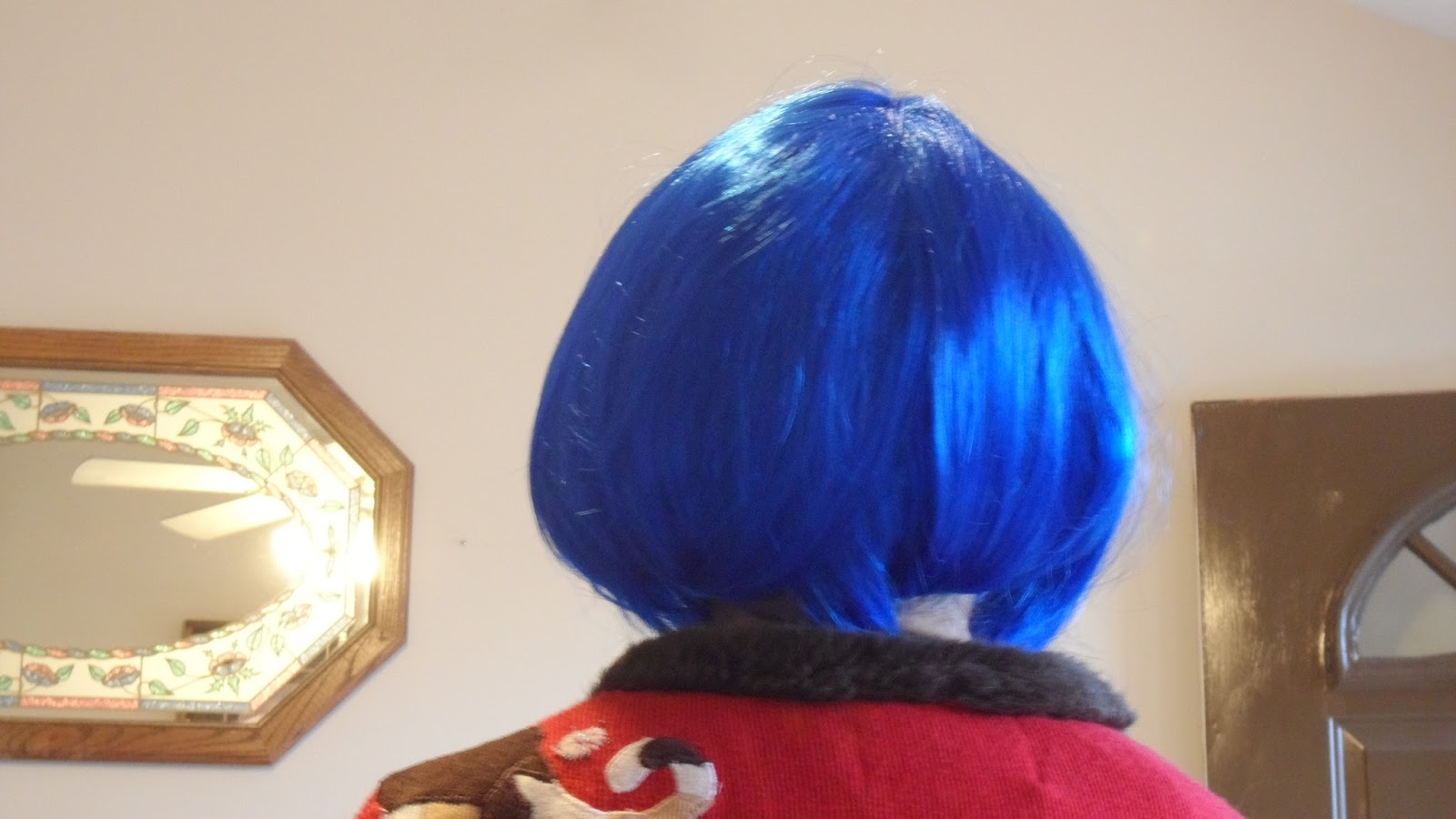 Candy modeling the blue wig I gave her. It will go with her blue butterfly dress for the Renfaire come June.