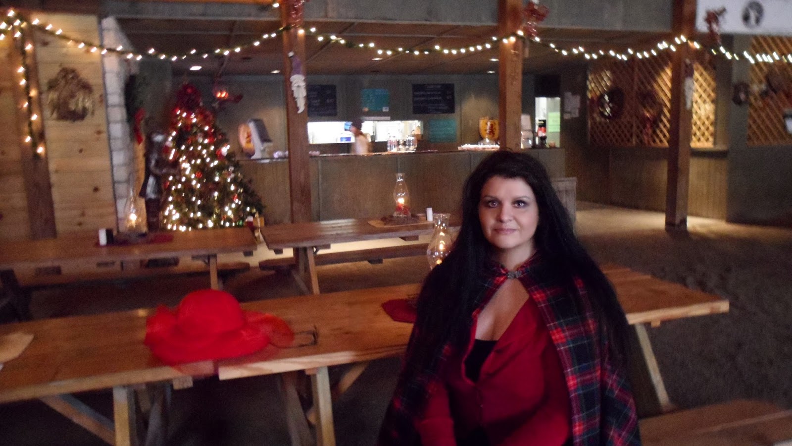 me in my Christmas red and tartan cape at Kentucky Renaissance Faire at the performance of Dickens' A Christmas Carol