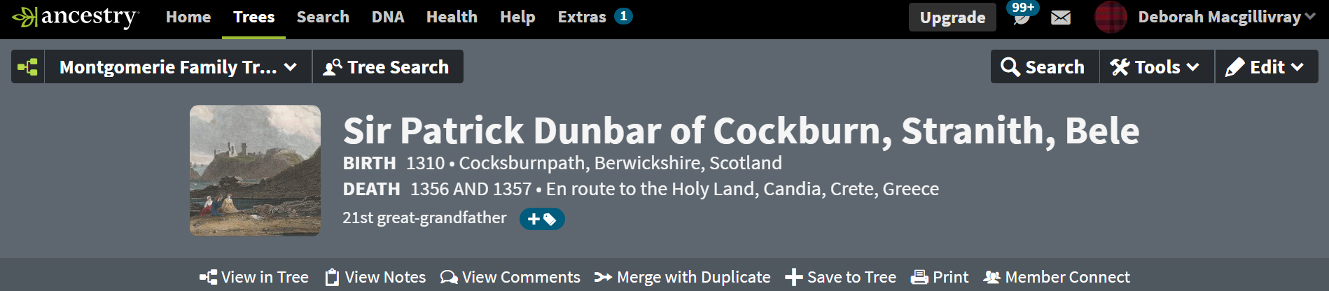 Agnes died in 1368 and was buried at Mordington, at a church established and patronized by the family. Patrick died a few months later in Crete, on route to the Holy Land. Perhaps he did love his Agnes and was making the pilgrimage after losing her. Before leaving Scotland he had arranged the security of the vast Moray and Dunbar estates. As his sons by his first marriage preceded him in death, Agnes nephew (Patrick’s grandnephew), George Dunbar, received Dunbar & March, Man and Annandale. John, the younger brother, was eventually confirmed earl of Moray.