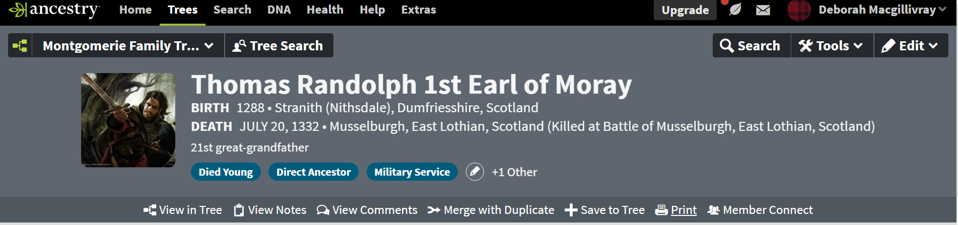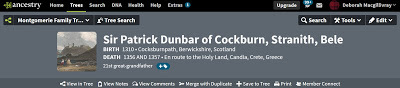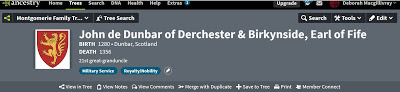 One of the first projects I posted online was my research into Marjorie Comyn, Countess of Dunbar and March (my 25th great-grandmother). Marjorie came from Scottish nobility on both sides of her family. Daughter of Alexander Comyn, 2nd earl of Buchan and Elizabeth de Quincy(daughter of Sir Roger de Quincy, earl of Winchester), Marjorie married Cospatrick Dunbar, 8th earl of Dunbar, 7th earl of March (an ancient lineage going back to the original warrior kings of the Scots). Cospatrick carried the nickname "Blackbeard the Competitor" for he was one of thirteen men vying for the crown of the Scots in 1290, after the deaths of Alexander III and his only heir the Maid of Norway.