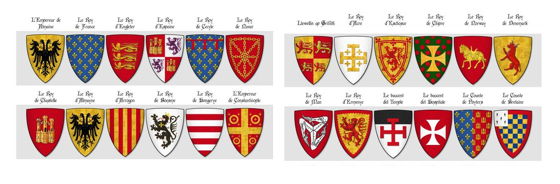 Touches, chevalier of worship, carried gules with yellow martlets. Banner gules, a lion argent, there the Earl of Lennox flew, and upon a silver border roses of the field’s same hue; Patrick of Dunbar, his son, bore likewise with a label blue.
