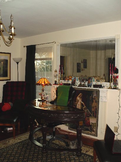 I love going antiquing, and we have a marvelous store just down the road. I have found some great items there. A new acquisition ― a second desk ― a roll-top oak is in one corner. I am not sure it’s going to stay in the room permanently. I am considering putting a full-size carousel horse there. All about the room, I have several glass carousel horses with medieval style. On one wall behind my desk, I designed a wonderful display with a tapestry of Edmund Blair Leighton’s “The Accolade”, that my marvelous contractor Joe Crabtree brought into being.
