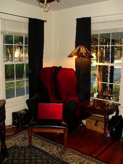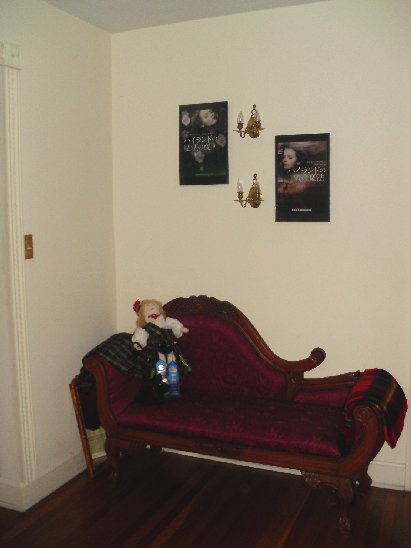 I learnt long ago, I cannot write on a PC for long. It caused tendonitis of my neck and right wrist. In my agony, I discovered I could work all day on a laptop and not suffer these problems. So while I had my desk to work at when I need space, generally I am found with my legs up and me oh so comfortable in one of the black chairs.I also have a lovely Victorian settee, which I share with my dolly, made by Candy Thompson (sister of the late author Dawn Thompson). Candy, as well, crocheted me a huge red and black afghan (seen in the second picture)― perfect for my black and dark red office theme.