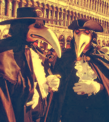 One of the more bizarre ones you will see is the Medico Della Peste (Plague Doctor). These startling bird-beak style masks were created in the 1600s by a French physician Charles de Lorme, and not for the purposes of Carnival celebrating. Just the opposite, de Lorme formed them to protect doctors treating plague victims. By this time, foul airs were suspect as the cause of spreading the plague, and in response, naturally physicians wanted to guard themselves against infection. De Lorme decided plague tainted the air with these noxious fumes, so then if the physicians breathed perfumed air they would escape catching the disease. He created this grotesque mask that looked like a larger-than-life bird head. The exaggerated beak was filled with herbs, and the eye slits were covered with rose tinted lenses. Literally, several pieces of common knowledge have passed into our consciousness from this horrible period. The term looking through rose colored glasses, now meaning viewing the world in a beautiful tone, instead of facing reality, came from the creation of these physicians’ masks. The other was the old tome Ring Around the Rosie—a child’s rhyme that speaks about the mass spreading of deaths from the Black Death. Children of future generations repeated this morbid singsong without ever understanding what they were chanting. To further the protection of the healers, physicians wore hoods covering their head and shoulders, long gowns and capes, with huge white gloves that went all the way up their upper arms. The Japanese used the figure of Godzilla, first to explain the bombs that were dropped on them during WWII, and then through making Godzilla the protector of their island, they faced their terrors and made the nightmare less disturbing. The Venetians did the same in adopting this bizarre costume as part of the collection of characters. They were saying that death walked amongst them, and they mocked and laughed at mortality.