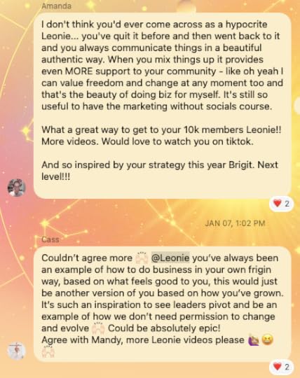 50 Things I Did, Loved, Experienced This Year…Started the year on holidays in Hervey Bay. It was just gorgeous to have a true summer holiday. We raced barefoot after the ice cream truck and spent hours in the pool. It was perfection. And definitely an inspiration for us to start thinking about buying a home with a pool!Loved it so much that we went back to Hervey Bay for another holiday for Easter. We’ve never really taken regular holidays before, but have started getting good at it now!Read 150 books. Roundup post of my favourites coming soon!Rebirthed the Brilliant Biz & Life Academy so I could go back to giving away ALL my courses & workbooks for a ridiculously affordable price.Ran a small group coaching program for the first time in a decade.Had lunch with Brigit Esselmont, Tash Corbin & Emma Vaiga-Malta. It was my first time meeting Tash in person after being friends online for YEARS and it was friend-love at first sight. Now enjoy her being referenced henceforth throughout this list because over this year she’s become one of my dearest mates.Got flooded in again.Purchased a new home to be closer to schools & the ocean again. Sold our acreage. It was a 10/10 move.Made a video meditation to honour leaving our acreage property.Moved Chris’ parents into our investment property in the same suburb as our new home. Another 10/10 decision. It’s been wonderful to have them close by!Adored the movie Encanto. The colours! The songs! The message! Everything!I was psychiatrically diagnosed with ADHD.Grieved the loss of my cousin & processed the shock of an awful thing.Much of this year was spent coping with the difficult news of a family member’s cancer diagnosis & the subsequent emotional fallout. Gosh it’s been a lot. I can’t say much more as it’s not my story to tell, but it’s been rough on multiple fronts.Created Get Organised in 21 Days course.Went to dinner with some local business goddesses – some I’d already met, some who were new to me. It was like magic happening right there. We knew instantly we wanted to stay in the room together, and become a mastermind. Since that glorious dinner we’ve had a spa afternoon, had a full day business brainstorming session and done a women’s circle together. I can’t wait to see their faces again. I’m so in love with Tash Corbin, Brigit Esselmont, Cass Deller, Madison Beaufort, Claire Riley and Amanda Rootsey. Our connection has been one of the biggest highlights of my year, and I can’t wait for what’s next.Made a poster on 8 ways to increase sales.Celebrated 12 months off social media. It’s now been almost 2 years as I type this!Did a Healthy Habits reset.I’ve swam more in 2022 than I have in years. Buying a home with a pool was a brilliant decision. Even today, one kid their friend over so they spent most of the day frolicking like mermaids. We notice how much bigger our kids smiles are when they are in water. And the same goes for us.After 4 years here on the Sunny Coast, my friend group is deepening and consolidating and it’s the most glorious thing. Like watching a field burst into wildflowers. And when I see them, somehow we always end up falling into the nearest body of water. It makes this mermaid heart of mine very happy.Made a free monthly goals business worksheet.Had tea & cake with Viv Guy!Recorded 19 podcast episodes of Leonie Dawson Refuses to Be Categorised. The most popular episode was me answering your Business & Marketing questions!Earlier in the year, we thought we were losing our 17 year old doggy Angel. But nope, she just had a bit of an upset belly, and after having explosive diarrhoea in our vet’s face, she was right as rain! After having her for 14 years, she is still obsessed by my husband (understandably) and only barely tolerates other humans or animals. We joke that my husband is HER support animal… she doesn’t cope without him.Created How To Hire & Manage A VA workshop.Had a mother-daughter spa date with my darling Madi. She’s one of my very favourite people on the planet. We met 3 years ago and we just can’t get enough of each other. Being around Madi is screeching when we laugh, big bosomy hugs and telling the truth. (Also, if you’re ever at Eumundi markets, find Madi’s art stall! She’s wildly talented. And she even has a print dedicated to my boobs!)Ran a live round of Marketing Without Social Media.Went through an absolute shitshow of 6 months at my kids’ school. It’s hard to communicate just how brutally stressful and debilitating it has been. It’s one thing to go through something personally, but when it involves your kids it’s a whole other level of awful. I’m so very much looking forward to a fresh start for them next year at a new school.Made a poster about acting on inspiration.Binged season 2 of Bridgerton. This year’s season wasn’t anywhere near as porny as season 1 and that was disappointing… still, I have high hopes for season 3, and I do love me a regency romance!Had to take an enforced screen sabbatical after developing an eye condition.Made an illustrated zine on being officially middle aged.Hired a house on a river for a family summer holiday with Chris’ parents. It was gorgeously fun!Taskmaster continues to be my very favourite TV show. I can talk for days how good it is and how often I can descend into scream laughing from it.My wee family got obsessed by Ryan Trahan’s challenge to travel across America on a penny. Funny, interesting & heart warming!Developed plantar fascitis. Added a podiatrist to my rolodex of humans I need to not be in pain. Craig is another 10/10 healer hottie (in a respectful, consensual way again). Got myself some custom orthotics & became an aficionado of sexy orthotic shoes. #canyoutelliammiddleagedAlso got obsessed by playing Star Stables. Nothing says fun like a digital world where you ride around on pretty ponies collecting stars for pony outfits. I started playing it with my kids, but they got bored 