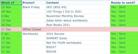 How I prepped my business so I could holiday for two monthsMy two part-time assistants worked through most of Dec & Jan (one only does Customer Service emails, the other is my general VA/Online Business Manager (OBM) who does everything else).We had a 10 day office shutdown over Christmas which both assistants had off.One assistant had more time off, the other covered for her.I stockpiled blog posts & emails so we had content to go out weekly on scheduleI set priorities for my OBM to work on while I was away. I tried to make them as measurable as possible. For example, to prep 10 Business Success Series blog posts for publishing.Here’s the content schedule we had: