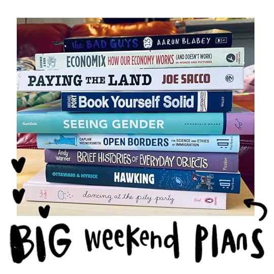 I have big weekend plans. See above. I treated myself to a new batch of graphic novels on a bunch of topics. I’m excited. We are also forecast rain which is SPLENDID. Rain + books = ultimate sensory relief. (You can find my yearly best books list here, incase you’re needing some new reads.)We had visitors for a few days and it was THE LOVELIEST. And so much socialising also had me in autistic shutdown afterwards. My auditory & speech function shut down a bit, and my brain felt like it was on fire at the edges. Am recovering now with a very quiet routine, weighted blankets, essential oils & all the rest. Sometimes it really shits me that I can’t just have a fun time with people and not have a sensory hangover afterwards.I mused to my husband that sometimes I’m not sure what’s my personality, and what’s my ASD. His response: “Ya know, I just don’t see it like that. Sure, you’ve got a diagnosis. But most of all, you’re Leonie. You’ve always been Leonie. That’s the most important thing.” I think I’ll get that tattooed on my arse.Our visitors were lovely relatives have been married for close to 50 years. It’s a real joy to spend time with people who’ve been in love for so long and are still so clearly in love. It’s like a little portal into the future of what me and Mr D will be.I may have to start my next 21 day challenge a little bit later in May. Mama’s brain needs a reset from new information.We have a new bird friend to add to our backyard regulars. Currently we have three pee wees named Jerry, Gerry and Jeri, and a magpie, Nut, who is a beleaguered single dad to two adolescents named Cashew and Almond. There are many more, but these are the ones we have see daily and have attached extensive backstories and personalities to. Now there is a new bird on the block – an eagle who has taken to flying over our property, calling distinctively. It’s a beautiful sound. I have named him Terry Muller, after a childhood friend who passed away a couple of years ago. Terry always told everyone he saw that they looked beautiful today, and I like to think that eagle is doing the same.The Prices-Are-Doubling sale is almost finished, along with a month of daily blogging and podcasting. I’m proud of what I’ve been able to create and share. I need a wee nap, and then I can get on with all the new goodies I want to make next.Big love,
