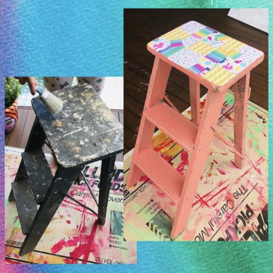 the big cloud-like armchair we’ve had for 12 years that is by far my favourite reading and writing chair. It’s peeling now, and our dogs have scratched it to blazes. And yet I’ll keep holding on to it for as long as I can.a chipboard bookcase we bought 17 years ago and painted blue. It’s been moved all over the country and it’s still going strong! I just repainted one side because it was looking a bit grotty. a cupboard that was left in one of our old houses when we bought it (it used to be garage storage). I repainted it and collaged it with scrapbook paper and glitter Mod Podge. I can’t bear to part with it now.colourful woven rag rugs that I bought years ago for my kid’s roomsa gaudy rainbow chandelier I bought cheaply 7 years ago but couldn’t find the right place to hang until now.