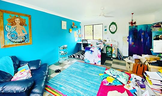 This week I was finally able to move in. Desk in first. I have a basic plain white one that my husband bought from Officeworks and I traded him for a few years later. I turned it into a large L-shaped desk by adding a long trestle table to the side. I’ve had the trestle table for probably 15 years now. I bought it when I used to sell art at markets. The top is old and grotty, so I got some mermaid contact from Bunnings and laid it over the top. It looks fucking bonza now, and I feel like a legit DIY legend.