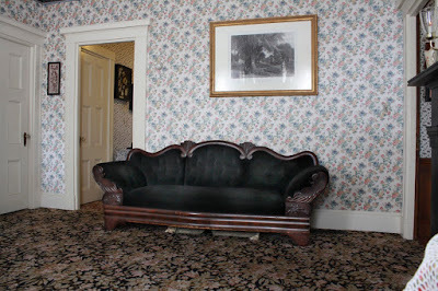 Andrew Borden arrived home around 11 a.m., unaware his wife was dead upstairs. He lay down for a nap on the sofa on the first floor, where he was struck in the face with a hatchet 10-11 times. This is the sofa.