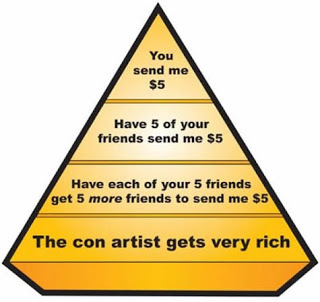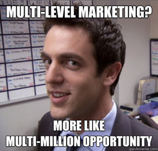 By the way, it's no longer acceptable to call it a "pyramid scheme." Every single one of these companies calls it either "network marketing" or "referral marketing." It's still this: