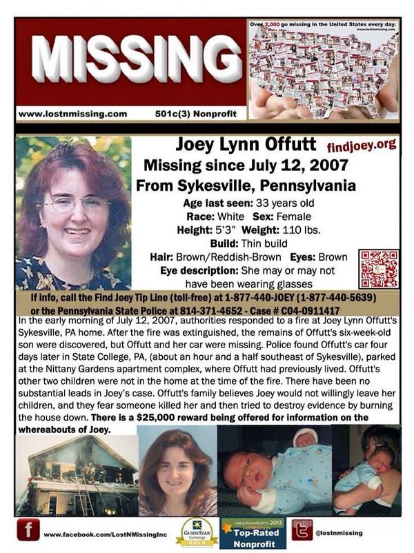 On July 12, 2007, neighbors called for help after hearing a loud explosion at Joey Lynn Offutt's house. Her home was in flames by the time emergency personnel arrived. Joey's six-month-old son was killed in the fire but Joey and her red Saturn were missing.