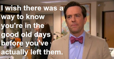 Recently as I rewatched the finale of The Office, Andy said something that resonated with me. I even remember hearing it the first time the episode aired and thinking it was one of the most beautiful things I've heard. While working at Dunder Mifflin, Andy looked back nostalgically on his days at Cornell. He left Dunder Mifflin to work at Cornell and spent all his time remembering "the good old days" at Dunder Mifflin. His profound statement was this: