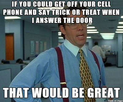 Or will they? Over time, as more and more people accept uncostumed adults on Halloween night, more and more people will be doing this: