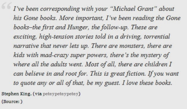 It was bugging me so much, I had to look it up. Turns out, Stephen King's a supporter of Gone, which was a very popular YA series. Rightly so, since it's really, really good. Not only that--Under the Dome was released in 2009, just after Gone's 2008 release--but way too soon to have been anything but a coincidence. Even Stephen King can't write that quickly.