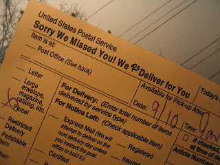We all hate those slips, don't we? I know when I worked 8-5, I groaned every time I saw a slip like that. Because the post office isn't open during hours that are convenient to the large number of Americans working in offices Monday-Friday, it means sacrificing a Saturday morning to stand in line.