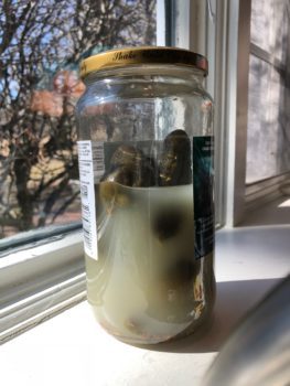 Bubbie’s lactate-fermented Kosher dill pickles are therefore worth knowing about. Bubbie’s pickles are fermented. You can see immediately that the brine is thick and murky, representing the dense probiotic organisms floating around. Here is a jar after agitating, sitting in my kitchen window: