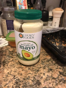 Katelyn: “I love the Chosen Foods mayo for chicken salad…organic chicken, celery, onion, and mayo, pulsed in the food processor, stuffed into tomatoes for a yummy lunch. Bought at Costco.”