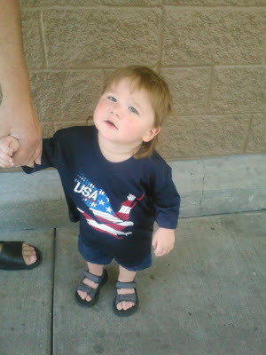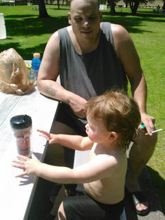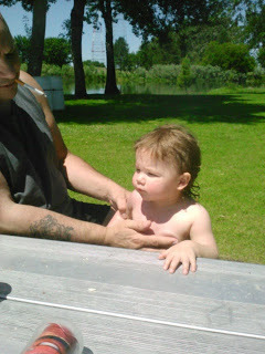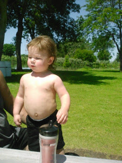 Micah was a big boy today! He got to sit at the picnic table with us >^.^<