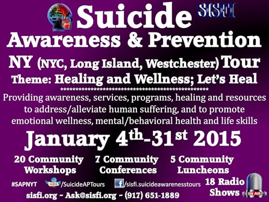 This month, I am honored to be working with Scudder Intervention Services Foundation, Inc. (SISFI) on their Suicide Awareness and Prevention Tour in New York City, Long Island and Westchester County, NY. While I relied on SISFI for support myself after my brother's suicide almost a year-and-a-half ago, I was shocked to learn that during their September tour they interrupted 192 attempted suicides! That's something else!!