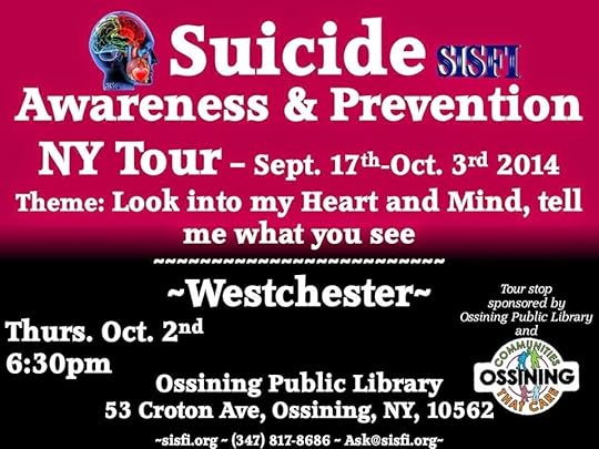 Hi, all. Please join me locally or visit SISFI for a full schedule of radio shows, workshops and other events taking place September 17th to October 3rd. Suicide affects each and every one of us whether someone close to us completes suicide or we know others who have been impacted or even mentioned it aloud. This is especially timely due to the loss of comedian Robin Williams and, more personally for me, my brother, Steve Crohn. Thank you to Ossining Public Library and Ossining Communities That Care for making this happen in my hometown.