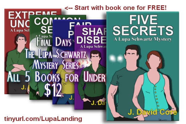 After this weekend all prices return to normalAs you know - or should know if you actually read my blog ;) - The fifth book in the Lupa Schwartz mystery series, Five Secrets, dropped last month. The eBook version was released at the introductory price of $2.99 and the prices of books 2,3, and 4 were set to match. Book one is free in eBook, so all five books were available for less than $12. On Monday, the prices will begin returning to normal. Book one will remain free indefinitely as an incentive for new readers of the series, but book's 2, 4 and 5 will all be increasing in price. Book 2 will be $3.99 and books 4 and 5 will each be $4.99.So get the series NOW while you still have the chance to save. Find the links to your favorite retailer at tinyurl.com/LupaLanding