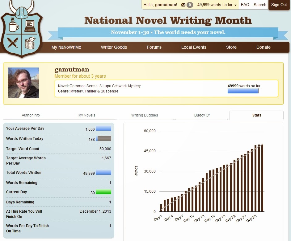 So in October, I outlined the story anew, and prepared myself for NaNo 2013. Well, here we are one day shy of the last day of November, and today I will exceed 50,000 words early in chapter 35. I may even finish the final chapter tonight, but I will not post my results until sometime on the 30th. For the second time in two attempts I will complete NaNoWriMo a winner.