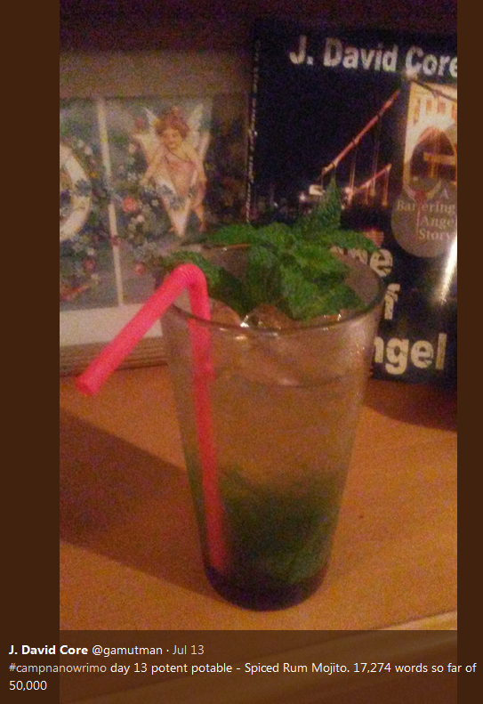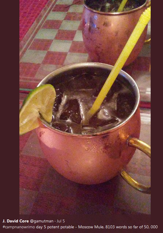 During the month, I also posted my word-count tally and my nightly cocktail on Twitter. I was able to actually come up with 31 distinct cocktails, a different one for each evening. Here are a few of my favorites. They can all be seen on my twitter feed @gamutman