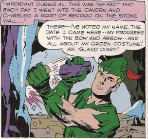 [ADVENTURE COMICS #256. Green Arrow was a backup feature for about two years, then went on to be a backup in WORLD'S FINEST.]In the story, wealthy playboy Oliver Queen is on a ship in the South Seas. Unlike the TV series, the ship doesn't go down in a raging storm. Oliver simply falls overboard. It’s not made clear whether he was so drunk he couldn’t walk straight, or he was just a klutz. He drifts with the current until he spots an island in the shape of a starfish. In contrast to ARROW the series, and YEAR ONE, it’s actually deserted.