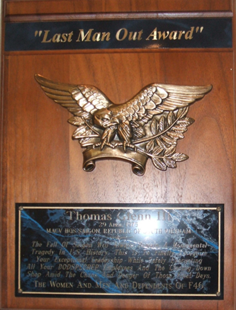 That plaque and my Civilian Meritorious Medal that I received for the lives I saved during the fall of Saigon remain today my most precious possessions.