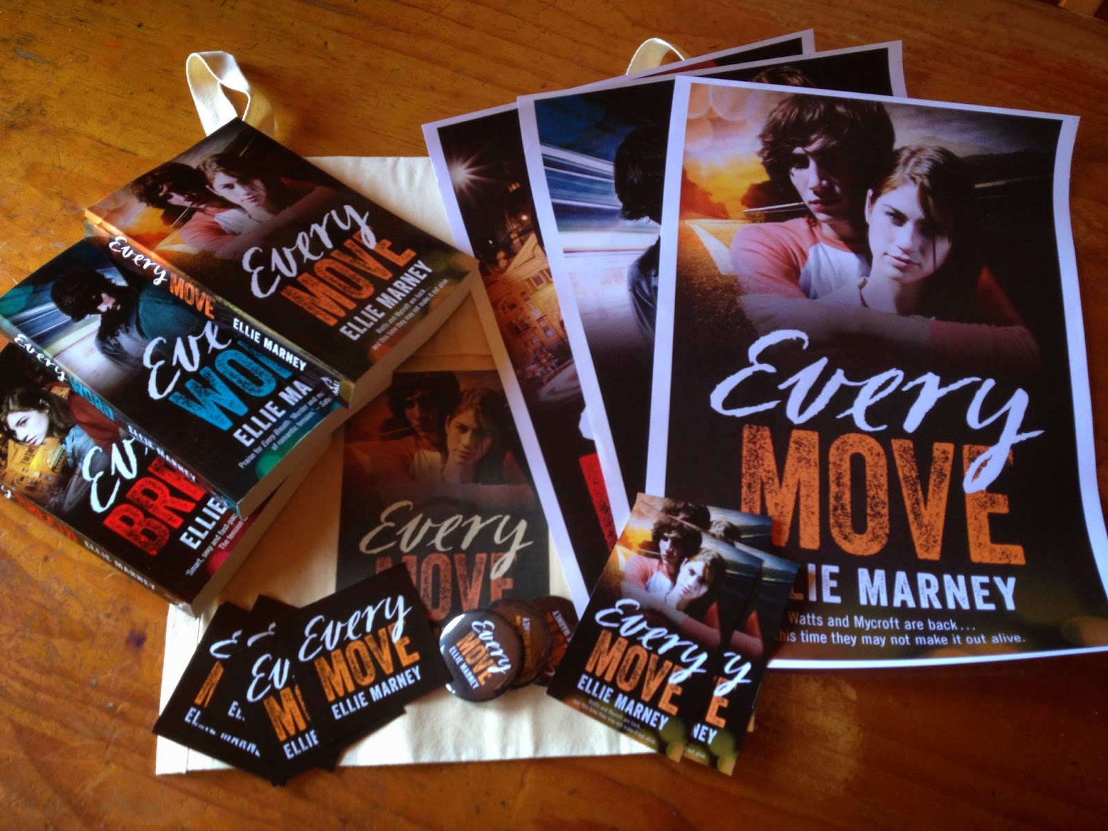 These are, I have to say, pretty spesh. Each pack consists of:*A full set of the Every series: Every Breath, Every Word and Every Move*A set of three posters (one for each book)*Three Every Move badges*Three lovely Every Move postcards*Six Every Move stickers, for your stickery enjoyment*All these things come wrapped inside a totally sweet Every Move library bag (or it could be an anything bag. I say it’s a library bag, cos I use mine at the library, but really – go nuts)
